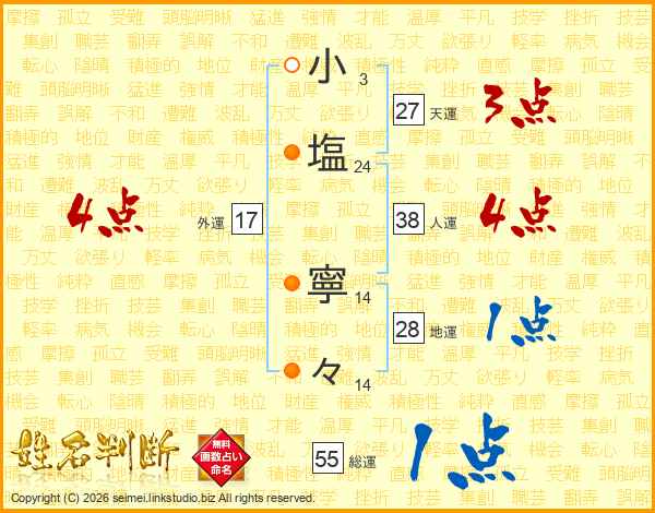 生活面を象徴する運勢です。外部から受ける影響力を表し、結婚運、家庭運や職場、環境への順応性を表します。総運から人運を引いた画数。姓や名が1文字の場合を除く。