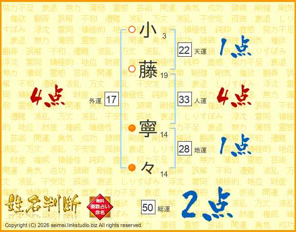 生活面を象徴する運勢です。外部から受ける影響力を表し、結婚運、家庭運や職場、環境への順応性を表します。総運から人運を引いた画数。姓や名が1文字の場合を除く。
