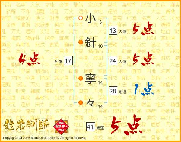 生活面を象徴する運勢です。外部から受ける影響力を表し、結婚運、家庭運や職場、環境への順応性を表します。総運から人運を引いた画数。姓や名が1文字の場合を除く。