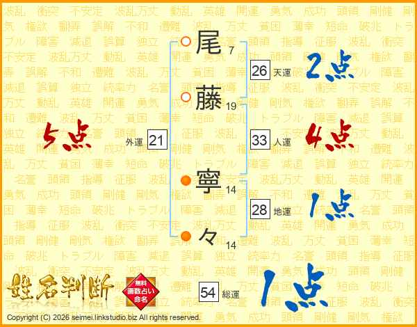尾(7画)藤(19画) 寧(14画)々(14画)