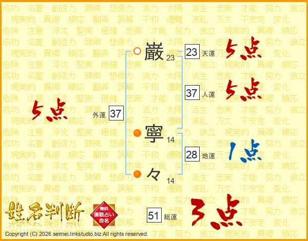 生活面を象徴する運勢です。外部から受ける影響力を表し、結婚運、家庭運や職場、環境への順応性を表します。総運から人運を引いた画数。姓や名が1文字の場合を除く。