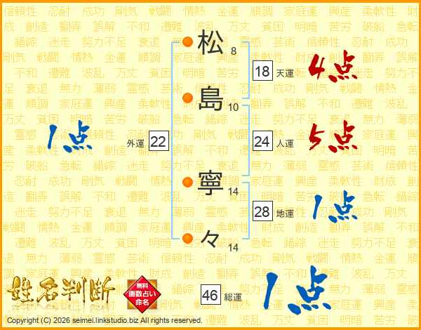 生活面を象徴する運勢です。外部から受ける影響力を表し、結婚運、家庭運や職場、環境への順応性を表します。総運から人運を引いた画数。姓や名が1文字の場合を除く。
