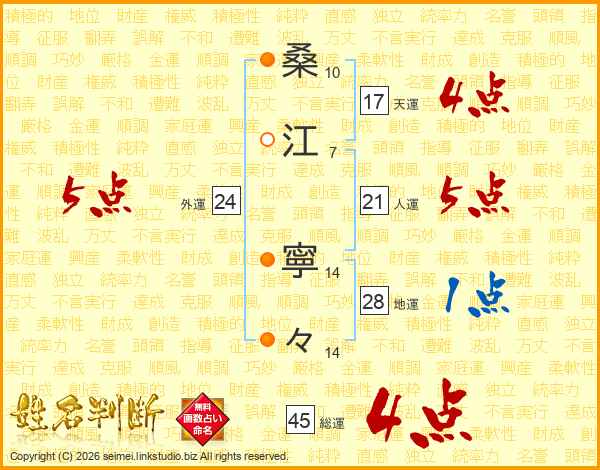 桑(10画)江(7画) 寧(14画)々(14画)