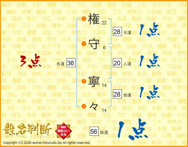 権(22画)守(6画) 寧(14画)々(14画)