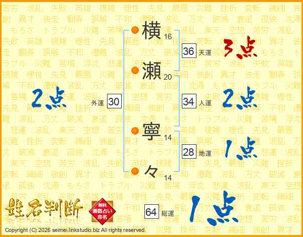 横(16画)瀬(20画) 寧(14画)々(14画)