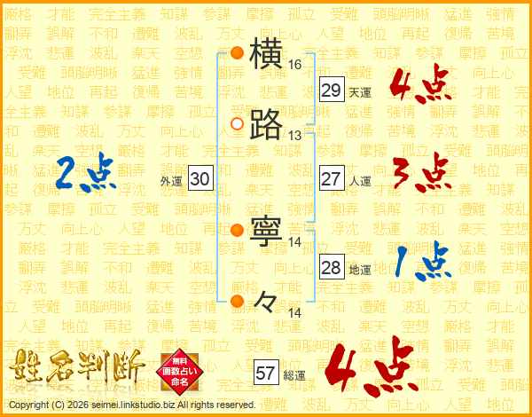 家系が持つ宿命的な運勢を表します。祖先から受け継いだ苗字ですので自分の力が及びません。家柄を象徴します。苗字の合計画数。