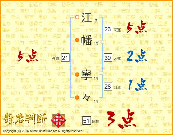 生活面を象徴する運勢です。外部から受ける影響力を表し、結婚運、家庭運や職場、環境への順応性を表します。総運から人運を引いた画数。姓や名が1文字の場合を除く。
