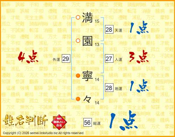 生活面を象徴する運勢です。外部から受ける影響力を表し、結婚運、家庭運や職場、環境への順応性を表します。総運から人運を引いた画数。姓や名が1文字の場合を除く。