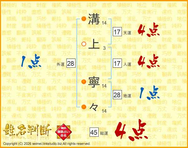 生活面を象徴する運勢です。外部から受ける影響力を表し、結婚運、家庭運や職場、環境への順応性を表します。総運から人運を引いた画数。姓や名が1文字の場合を除く。