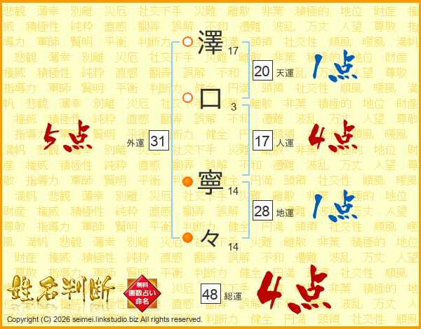 生活面を象徴する運勢です。外部から受ける影響力を表し、結婚運、家庭運や職場、環境への順応性を表します。総運から人運を引いた画数。姓や名が1文字の場合を除く。