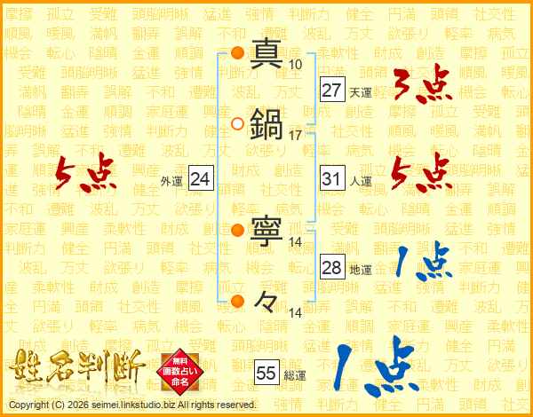 真(10画)鍋(17画) 寧(14画)々(14画)