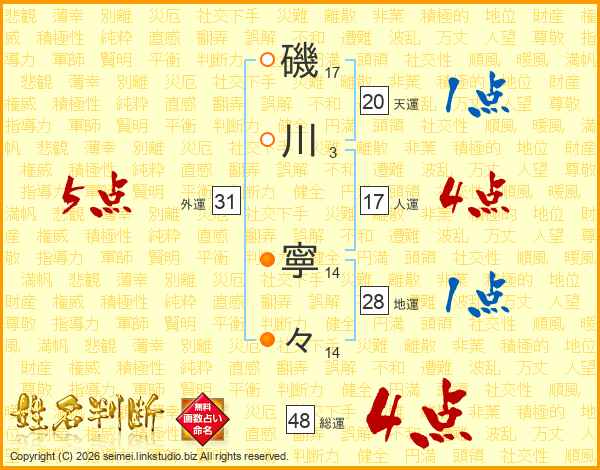 生活面を象徴する運勢です。外部から受ける影響力を表し、結婚運、家庭運や職場、環境への順応性を表します。総運から人運を引いた画数。姓や名が1文字の場合を除く。