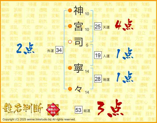 神(10画)宮(10画)司(5画) 寧(14画)々(14画)