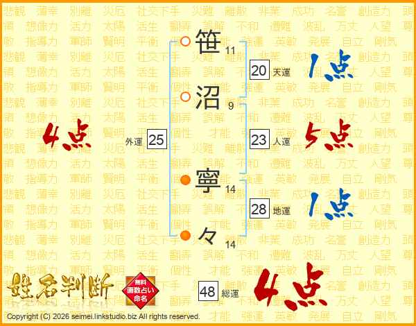 生活面を象徴する運勢です。外部から受ける影響力を表し、結婚運、家庭運や職場、環境への順応性を表します。総運から人運を引いた画数。姓や名が1文字の場合を除く。