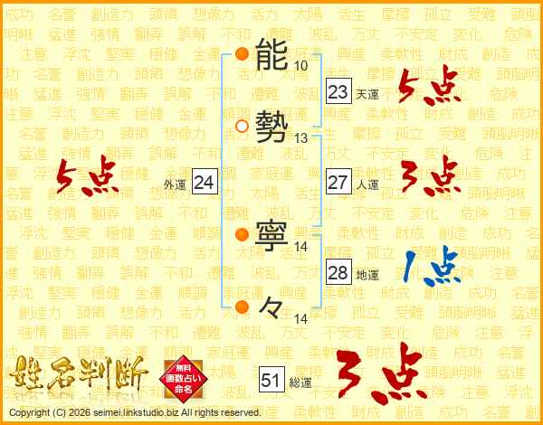 生活面を象徴する運勢です。外部から受ける影響力を表し、結婚運、家庭運や職場、環境への順応性を表します。総運から人運を引いた画数。姓や名が1文字の場合を除く。