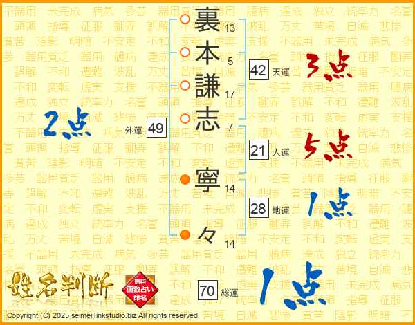 裏(13画)本(5画)謙(17画)志(7画) 寧(14画)々(14画)