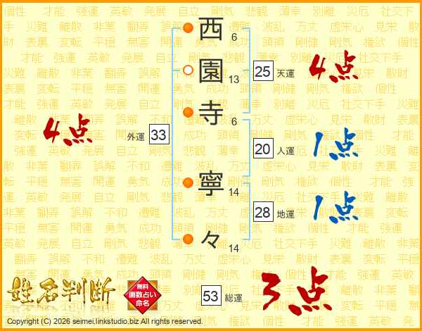 西(6画)園(13画)寺(6画) 寧(14画)々(14画)