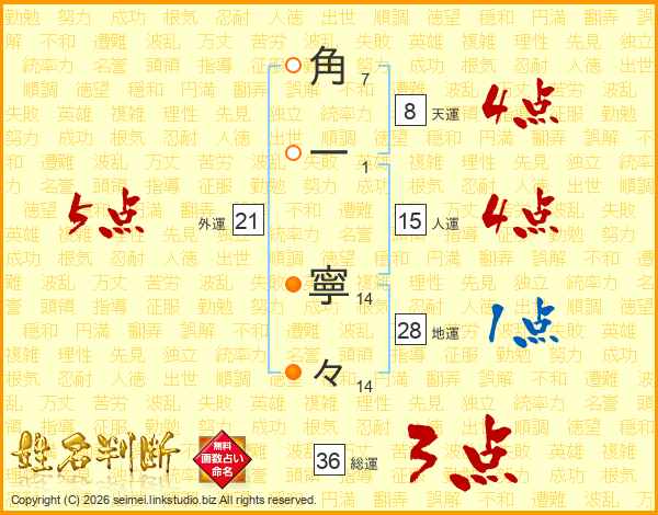 生活面を象徴する運勢です。外部から受ける影響力を表し、結婚運、家庭運や職場、環境への順応性を表します。総運から人運を引いた画数。姓や名が1文字の場合を除く。