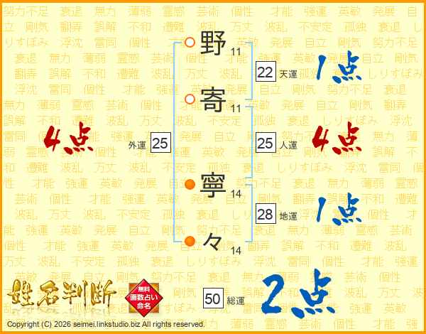 生活面を象徴する運勢です。外部から受ける影響力を表し、結婚運、家庭運や職場、環境への順応性を表します。総運から人運を引いた画数。姓や名が1文字の場合を除く。