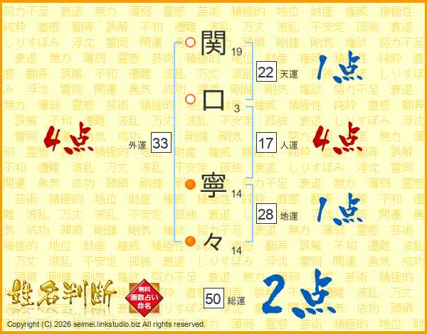 生活面を象徴する運勢です。外部から受ける影響力を表し、結婚運、家庭運や職場、環境への順応性を表します。総運から人運を引いた画数。姓や名が1文字の場合を除く。