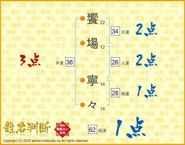 生活面を象徴する運勢です。外部から受ける影響力を表し、結婚運、家庭運や職場、環境への順応性を表します。総運から人運を引いた画数。姓や名が1文字の場合を除く。