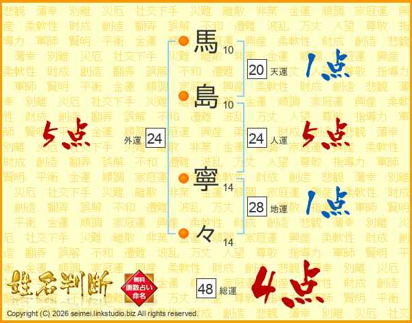 生活面を象徴する運勢です。外部から受ける影響力を表し、結婚運、家庭運や職場、環境への順応性を表します。総運から人運を引いた画数。姓や名が1文字の場合を除く。