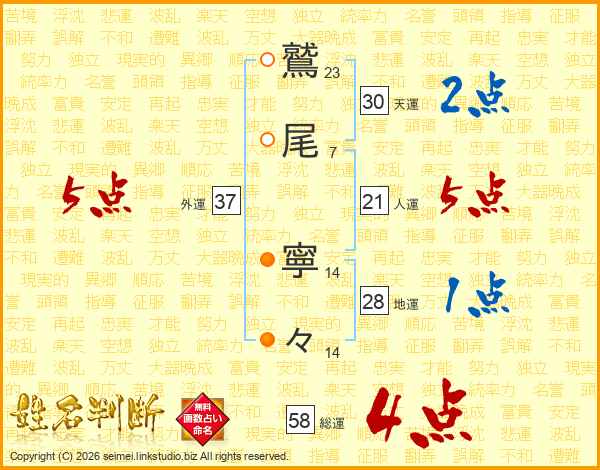 鷲(23画)尾(7画) 寧(14画)々(14画)