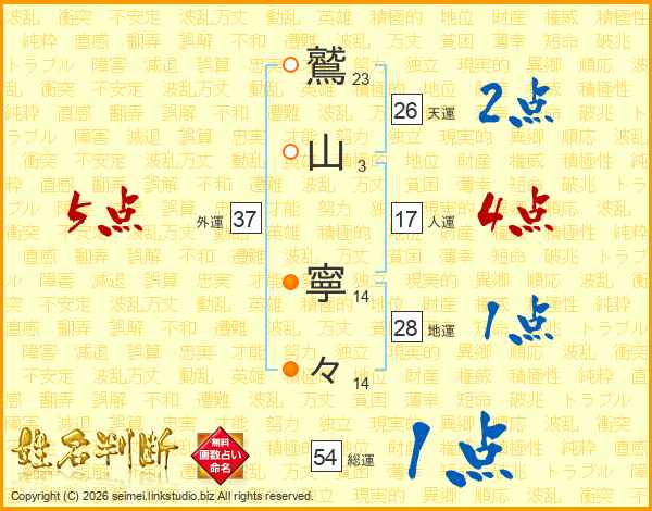 鷲(23画)山(3画) 寧(14画)々(14画)