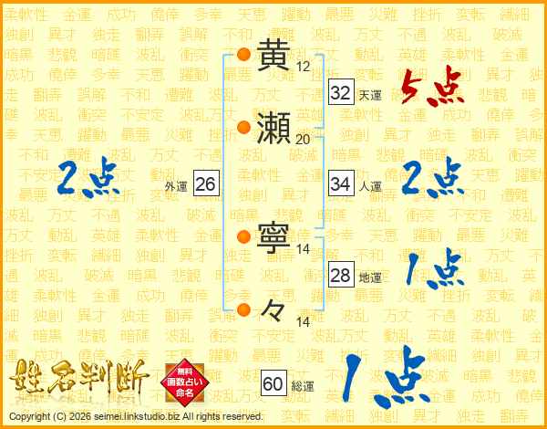 黄(12画)瀬(20画) 寧(14画)々(14画)