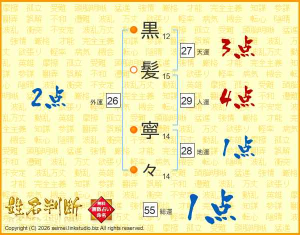 黒(12画)髪(15画) 寧(14画)々(14画)