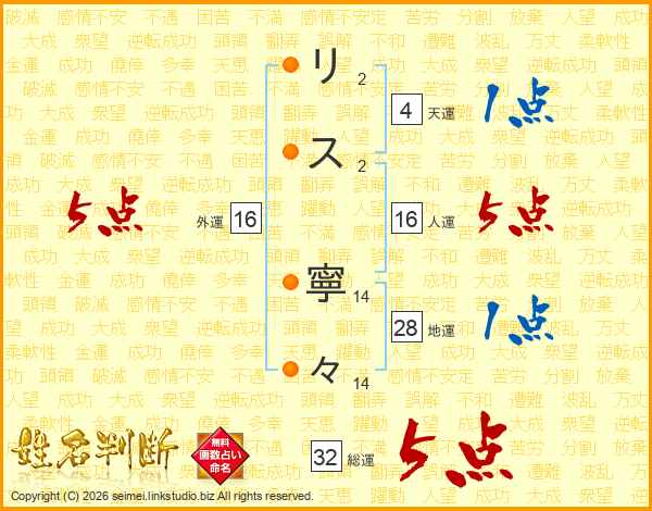リ(2画)ス(2画) 寧(14画)々(14画)