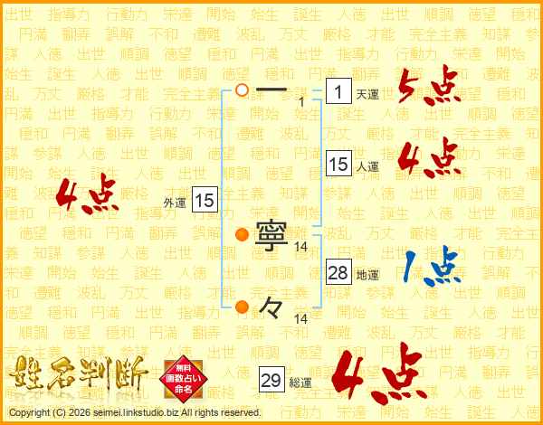 生活面を象徴する運勢です。外部から受ける影響力を表し、結婚運、家庭運や職場、環境への順応性を表します。総運から人運を引いた画数。姓や名が1文字の場合を除く。