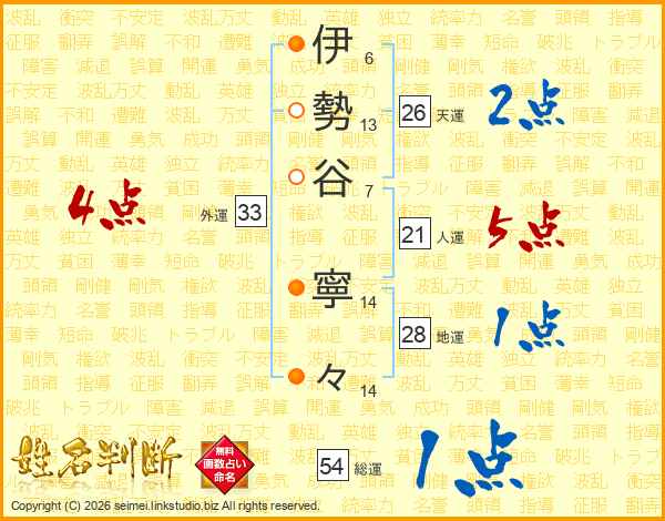 伊(6画)勢(13画)谷(7画) 寧(14画)々(14画)