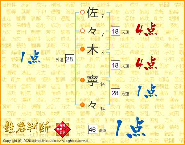 佐(7画)々(7画)木(4画) 寧(14画)々(14画)