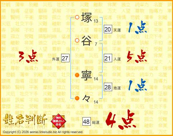 塚(13画)谷(7画) 寧(14画)々(14画)