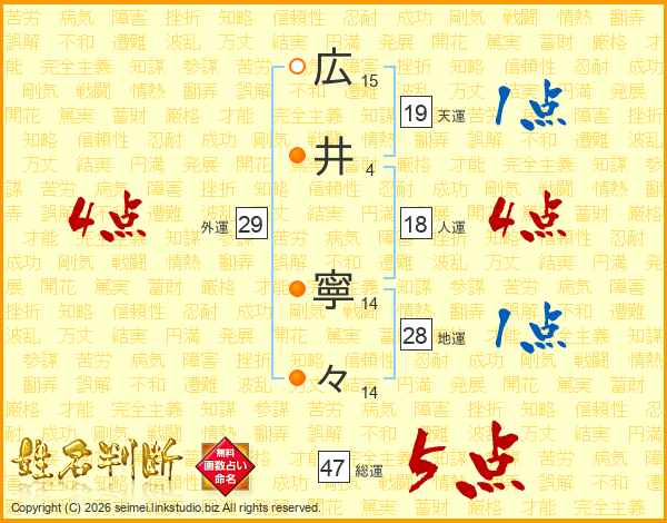 生活面を象徴する運勢です。外部から受ける影響力を表し、結婚運、家庭運や職場、環境への順応性を表します。総運から人運を引いた画数。姓や名が1文字の場合を除く。