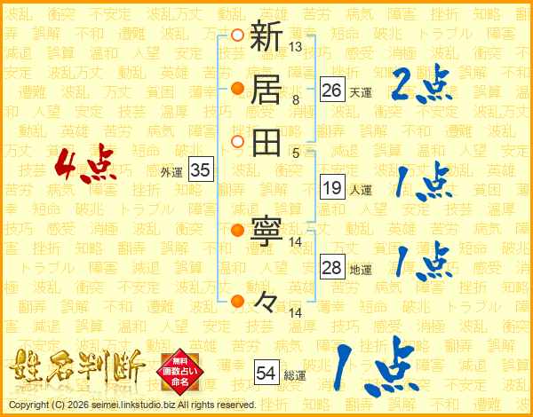 新(13画)居(8画)田(5画) 寧(14画)々(14画)