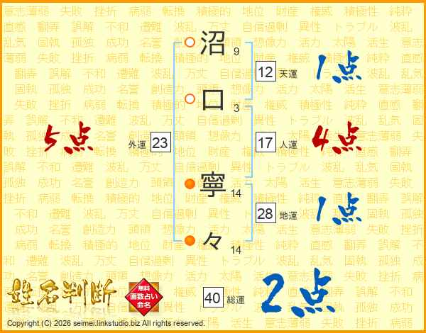 生活面を象徴する運勢です。外部から受ける影響力を表し、結婚運、家庭運や職場、環境への順応性を表します。総運から人運を引いた画数。姓や名が1文字の場合を除く。