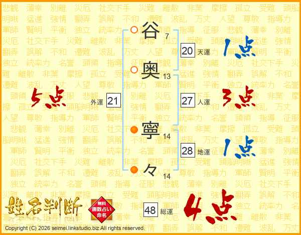 谷(7画)奥(13画) 寧(14画)々(14画)