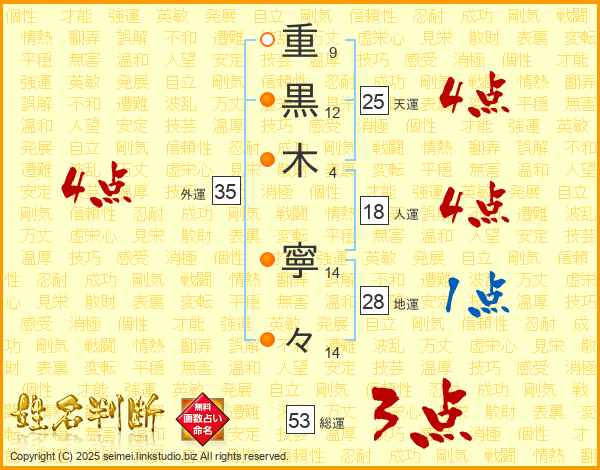 重(9画)黒(12画)木(4画) 寧(14画)々(14画)