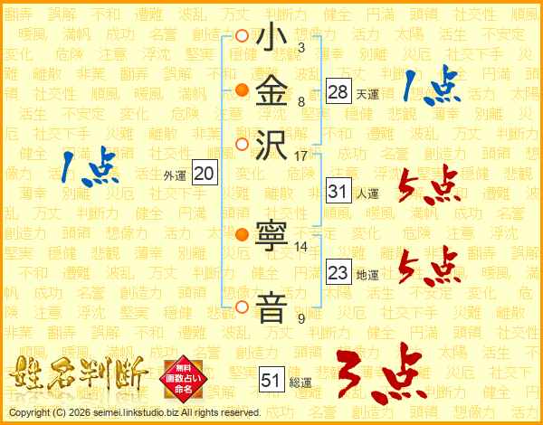 小(3画)金(8画)沢(17画) 寧(14画)音(9画)