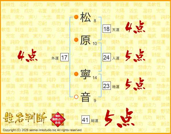 生活面を象徴する運勢です。外部から受ける影響力を表し、結婚運、家庭運や職場、環境への順応性を表します。総運から人運を引いた画数。姓や名が1文字の場合を除く。