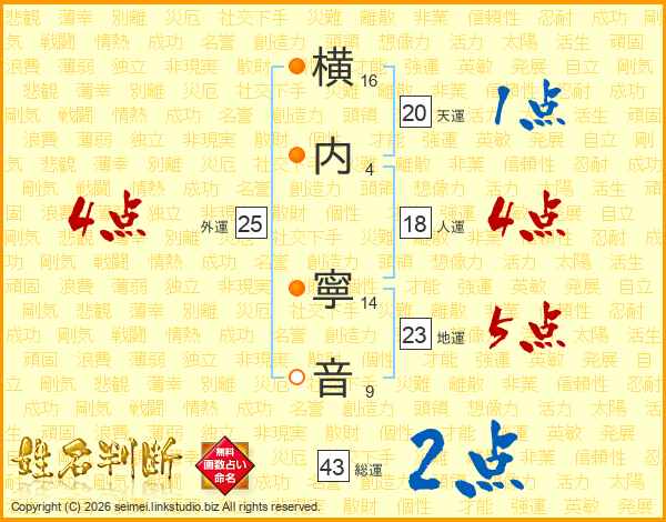 生活面を象徴する運勢です。外部から受ける影響力を表し、結婚運、家庭運や職場、環境への順応性を表します。総運から人運を引いた画数。姓や名が1文字の場合を除く。