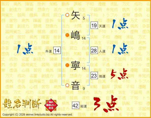 矢(5画)嶋(14画) 寧(14画)音(9画)