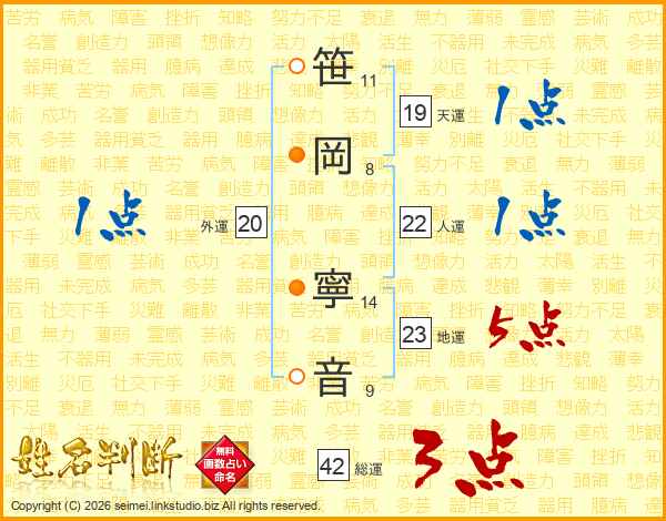 笹(11画)岡(8画) 寧(14画)音(9画)