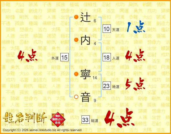 生活面を象徴する運勢です。外部から受ける影響力を表し、結婚運、家庭運や職場、環境への順応性を表します。総運から人運を引いた画数。姓や名が1文字の場合を除く。