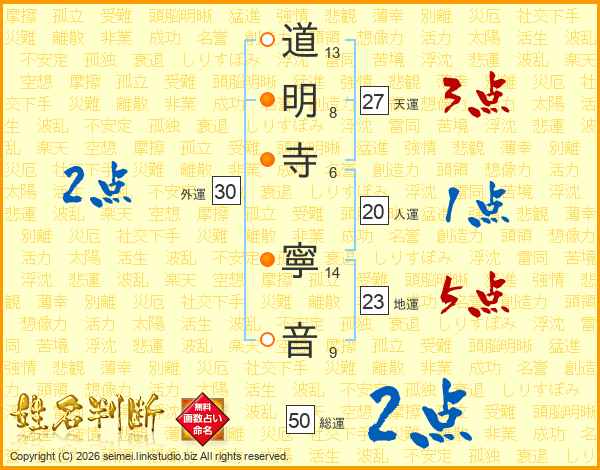 道(13画)明(8画)寺(6画) 寧(14画)音(9画)
