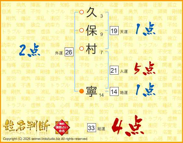 生活面を象徴する運勢です。外部から受ける影響力を表し、結婚運、家庭運や職場、環境への順応性を表します。総運から人運を引いた画数。姓や名が1文字の場合を除く。