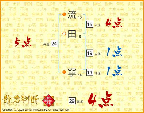生活面を象徴する運勢です。外部から受ける影響力を表し、結婚運、家庭運や職場、環境への順応性を表します。総運から人運を引いた画数。姓や名が1文字の場合を除く。