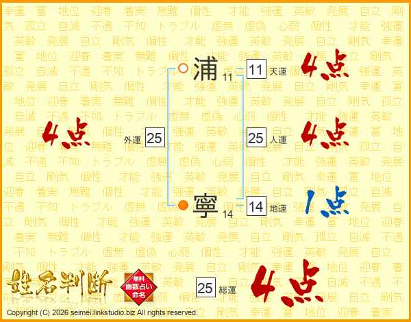 生活面を象徴する運勢です。外部から受ける影響力を表し、結婚運、家庭運や職場、環境への順応性を表します。総運から人運を引いた画数。姓や名が1文字の場合を除く。